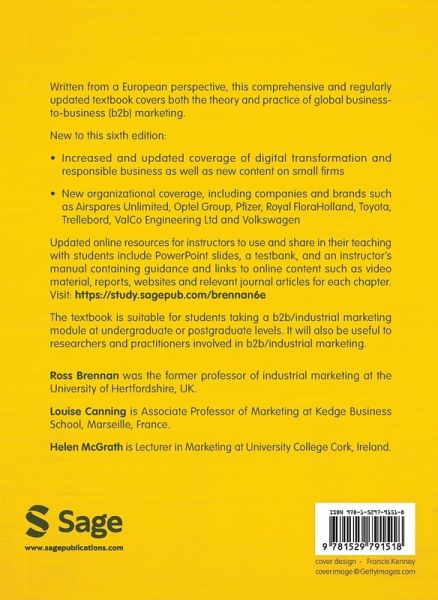 Written from a European perspective, this comprehensive and regularly updated textbook covers both the theory and practice of global business-to-business (b2b) marketing. New to this sixth edition: * Increased and updated coverage covering digital transformation and responsible business as well as new content on small firms * New organizational coverage, including companies and brands such as Airspares Unlimited, Optel Group, Pfizer, Royal FloraHolland, Toyota, Trellebord,ValCo Engineering Ltd and Volkswagen * Updated online resources for instructors to use and share in their teaching with students, including PowerPoint slides, a testbank, and an instructor's manual containing guidance and links to online content such as video material, reports, websites and relevant journal articles for each chapter The textbook is suitable for students taking a b2b/industrial marketing module at undergraduate or postgraduate levels. It will also be useful to researchers and practitioners involved in b2b/industrial marketing. Ross Brennan was the former professor of industrial marketing at the University of Hertfordshire, UK. Louise Canning is Associate Professor of Marketing at Kedge Business School, Marseille France. Helen McGrath is Lecturer in Marketing at University College Cork, Ireland.