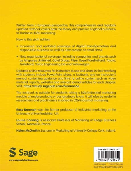The textbook is suitable for students taking a b2b/industrial marketing module at undergraduate or postgraduate levels. It will also be useful to researchers and practitioners involved in b2b/industrial marketing. Ross Brennan was the former professor of industrial marketing at the University of Hertfordshire, UK. Louise Canning is Associate Professor of Marketing at Kedge Business School, Marseille France. Helen McGrath is Lecturer in Marketing at University College Cork, Ireland.