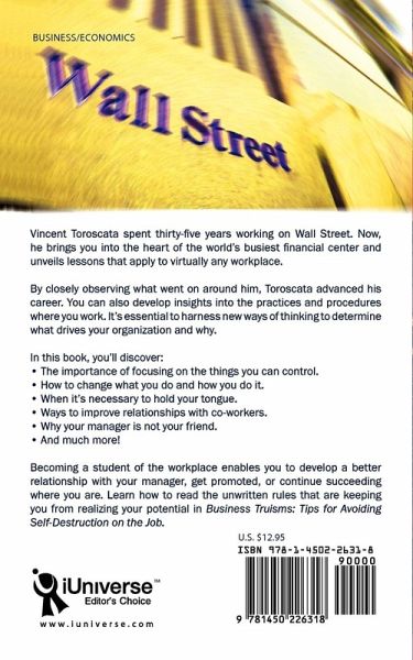 Vincent Toroscata spent thirty-five years working on Wall Street. Now, he brings you into the heart of the world's busiest financial center and unveils lessons that apply to virtually any workplace. By closely observing what went on around him, Toroscata advanced his career. You can also develop insights into the practices and procedures where you work. It's essential to harness new ways of thinking to determine what drives your organization and why. In this book, you'll discover: ¿ The importance of focusing on the things you can control. ¿ How to change what you do and how you do it. ¿ When it's necessary to hold your tongue. ¿ Ways to improve relationships with co-workers. ¿ Why your manager is not your friend. ¿ And much more! Becoming a student of the workplace enables you to develop a better relationship with your manager, get promoted or continue succeeding where you are. Learn how to read the unwritten rules that are keeping you from realizing your potential in Business Truisms: Tips for Avoiding Self-Destruction on the Job.