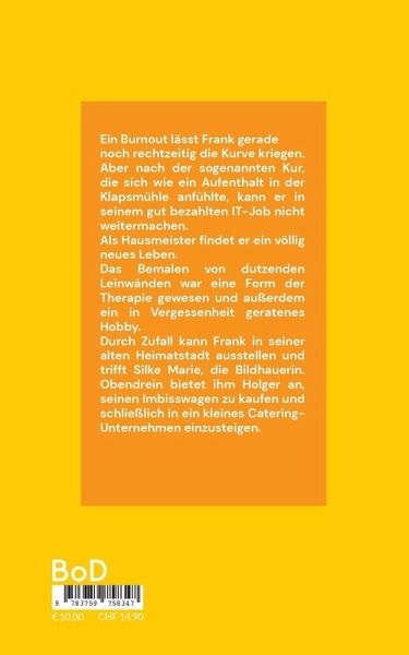 Ein Burnout lässt Frank gerade noch rechtzeitig die Kurve kriegen. Aber nach der sogenannten Kur, die sich wie ein Aufenthalt in der Klapsmühle anfühlte, kann er in seinem gut bezahlten IT-Job nicht weitermachen. Als Hausmeister findet er ein völlig neues Leben. Das Bemalen von dutzenden Leinwänden war eine Form der Therapie gewesen und außerdem ein in Vergessenheit geratenes Hobby. Durch Zufall kann Frank in seiner alten Heimatstadt ausstellen und trifft Silke Marie, die Bildhauerin. Obendrein bietet ihm Holger an, seinen Imbisswagen zu kaufen und schließlich in ein kleines Catering-Unternehmen einzusteigen.