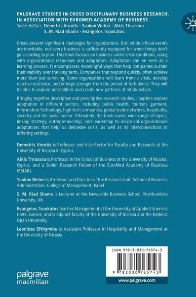 Bringing together descriptive and prescriptive research studies, chapters explore adaptation in different sectors, including public health, tourism, garment, Information Technology, high-tech companies, global trade networks, hospitality, security and the social sector. Ultimately, the book covers wide range of topics, linking strategy, entrepreneurship, and leadership to reciprocal organizational adaptations that help us delineate crisis, as well as its interconnections in differing settings.