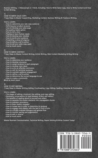 Business Writing - 3 Manuscripts in 1 Book, Including: How to Write Sales Copy, How to Write Content and How to Edit Writing 1) HOW TO WRITE SALES COPY: 7 Easy Steps to Master Copywriting, Marketing Content, Business Writing & Freelance Writing. YOU'LL LEARN:How to determine your sale copy audience Defining your product purpose How to develop your sales page Persuading reader action How to tell a story Playing on basic human needs How to develop your rebuttal How to excite your audience Presenting a sense of urgency How to define a call to action How to set your sales copy apart And so much more! 2) HOW TO WRITE CONTENT: 7 Easy Steps to Master Content Writing, Article Writing, Web Content Marketing & Blog Writing. YOU'LL LEARN:How to determine your audience How to develop a purpose How to assign purpose to each paragraph How to develop main ideas How to write an effective conclusion How to edit for technical purposes How to maintain audience engagement How to define a call to action How to determine the correct language to use How to create a community And so much more! 3) HOW TO EDIT WRITING: 7 Easy Steps to Master Writing Editing, Proofreading, Copy Editing, Spelling, Grammar & Punctuation. YOU'LL LEARN:The stages of editing: structural, line editing, and copy editing Necessary conversations to have between writers and editors The benefits of reading aloud to yourself and others How to separate the smaller elements into manageable chunks How to maintain consistency How to keep readers engaged How to isolate text in order to determine its purpose How to engage more deeply with the text in front of you How to critically evaluate dialogue and general flow How to monitor pacing and organization How to edit in reverse And so much more! Master Business Communication, Technical Writing, Report Writing & Write Content Today!