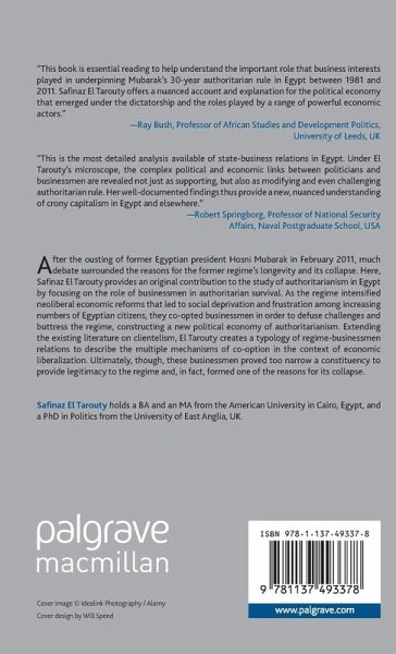 After the ousting of former Egyptian President Hosni Mubarak in February 2011, much debate surrounded the reasons for the former regime's longevity and its collapse. Here, Safinaz El Tarouty provides an original contribution to the study of authoritarianism in Egypt by focusing on the role of businessmen in authoritarian survival. As the regime intensified neoliberal economic reforms that led to social deprivation and frustration among increasing numbers of Egyptian citizens, they co-opted businessmen in order to defuse challenges and buttress the regime, constructing a new political economy of authoritarianism. Extending the existing literature on clientelism, El Tarouty creates a typology of regime-businessmen relations to describe the multiple mechanisms of co-option in the context of economic liberalization. Ultimately, though, these businessmen proved too narrow a constituency to provide legitimacy to the regime and, in fact, formed one of the reasons for its collapse.