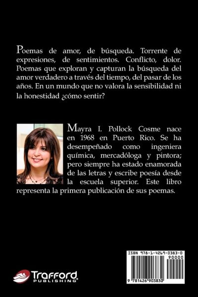 Poemas de amor, de búsqueda. Torrente de expresiones, de sentimientos. Poemas que exploran y capturan la búsqueda del amor verdadero a través del tiempo, del pasar de los años. Mayra I. Pollock Cosme lleva escribiendo más de 20 años y en este, su primer libro, desea compartir con el lector una especial selección de sus poemas. Cada verso de este poemario expresa los sentimientos, conflictos y dolor que forman parte de la búsqueda del amor verdadero a través de los años en un mundo que no valora la sensibilidad ni la honestidad. Sus poemas también nos cuentan de la soledad y de las travesías entre el amor y el desamor que todos experimentamos, y que a veces, no parecen terminar.