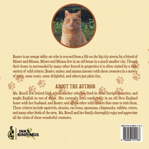 Buster is an orange tabby cat who is rescued from a life on the big city streets by a friend of Mister and Missus. Mister and Missus live in an old house in a much smaller city. Though their home is surrounded by many other fenced in properties it is often visited by a wide variety of wild critters. Buster, mister, and missus interact with these creatures in a variety of ways, some scary, some delightful, and others just plain fun.