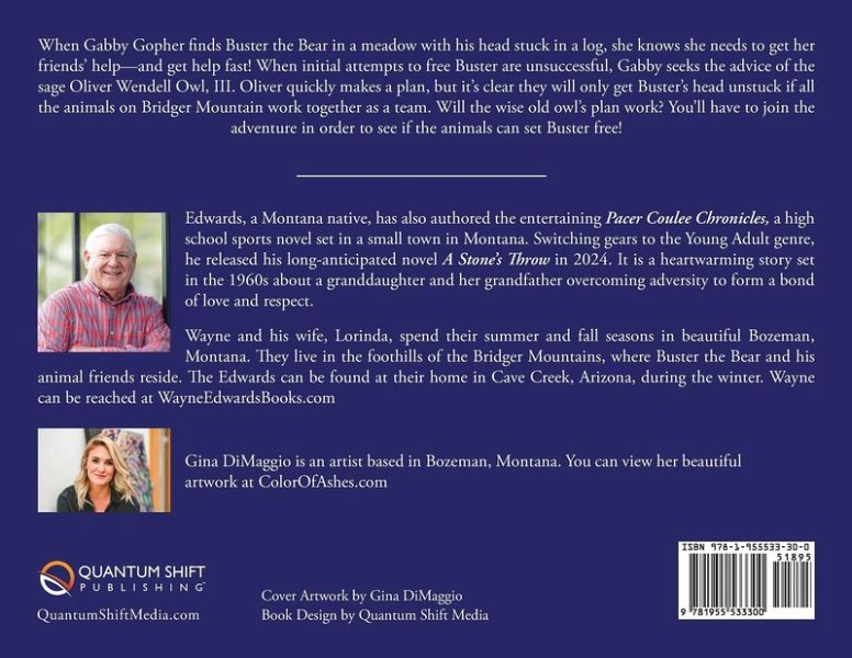 Edwards, a Montana native, has also authored the entertaining Pacer Coulee Chronicles, a high school sports novel set in a small town in Montana. Switching gears to the Young Adult genre, he released his long-anticipated novel A Stone's Throw in 2024. It is a heartwarming story set in the 1960s about a granddaughter and her grandfather overcoming adversity to form a bond of love and respect.Wayne and his wife, Lorinda, spend their summer and fall seasons in beautiful Bozeman, Montana. They live in the foothills of the Bridger Mountains, where Buster the Bear and his animal friends reside. The Edwards can be found at their home in Cave Creek, Arizona, during the winter.Wayne can be reached at WayneEdwardsBooks.com