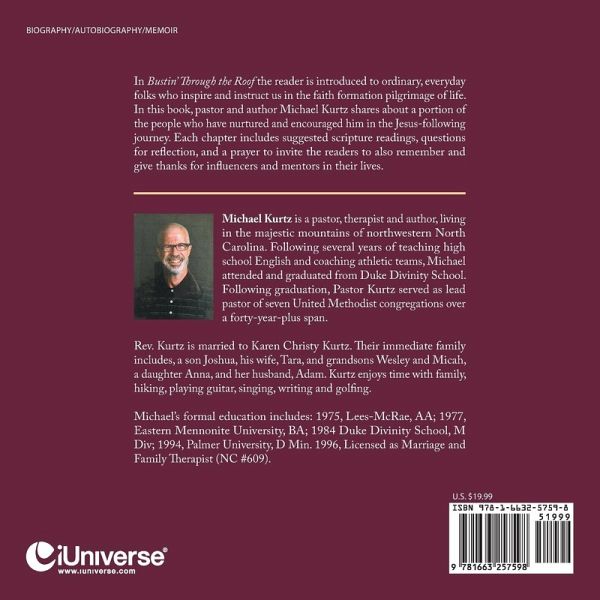 In Bustin' Through the Roof the reader is introduced to ordinary, everyday folks who inspire and instruct us in the faith formation pilgrimage of life. In this book, pastor and author Michael Kurtz shares about a portion of the people who have nurtured and encouraged him in the Jesus-following journey. Each chapter includes suggested scripture readings, questions for reflection, and a prayer to invite the readers to also remember and give thanks for influencers and mentors in their lives.