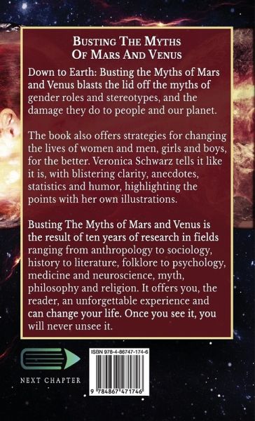 Down to Earth: Busting the Myths of Mars and Venus blasts the lid off the myths of gender roles and stereotypes, and the damage they do to people and our planet. The book also offers strategies for changing the lives of women and men, girls and boys, for the better. Veronica Schwarz tells it like it is, with blistering clarity, anecdotes, statistics and humor, highlighting the points with her own illustrations. Busting The Myths of Mars and Venus is the result of ten years of research in fields ranging from anthropology to sociology, history to literature, folklore to psychology, medicine and neuroscience, myth, philosophy and religion. It offers you, the reader, an unforgettable experience and can change your life. Once you see it, you will never unsee it.