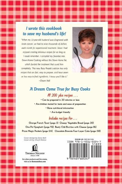 I wrote this cookbook to save my husband's life! "When my 32-year-old husband was diagnosed with brain cancer, we had to raise thousands of dollars each month for experimental treatment. Since I had enjoyed creating delicious recipes for as long as I could remember, I compiled my favorites into Down-Home Cooking without the Down-Home Fat, which funded the treatment that cured him completely. This new Busy People's edition has only recipes that are fast, easy to prepare and have seven or less easy-to-find ingredients. I know you'll like it." -Dawn Hall A dream came true for busy cooks. All 200 plus recipes: Can be prepared in 30 minutes or less Are kitchen tested for taste and ease of preparation Have nutritional information Are budget friendly Praise for Busy People's Down-Home Cooking Without the Down-Home Fat "Great for the working family and those on the go." -Lori L. Scovel, Manchester Press "I love the cookbook because it's so user-friendly." -Betsy Bethel, Wheeling, WV