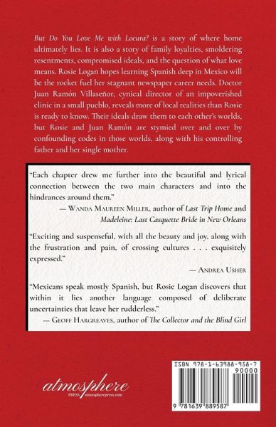 But Do You Love Me with Locura? is a story of where home ultimately lies. It is also a story of family loyalties, smoldering resentments, compromised ideals, and the question of what love means. Rosie Logan hopes learning Spanish deep in Mexico will be the rocket fuel her stagnant newspaper career needs. Doctor Juan Ramón Villaseñor, cynical director of an impoverished clinic in a small pueblo, reveals more of local realities than Rosie is ready to know. Their ideals draw them to each other's worlds, but Rosie and Juan Ramón are stymied over and over by confounding codes in those worlds, along with his controlling father and her single mother. "Each chapter drew me further into the beautiful and lyrical connection between the two main characters and into the hindrances around them." Wanda Maureen Miller, author of Last Trip Home and Madeleine: Last French Casquette Bride in New Orleans "Exciting and suspenseful, with all the beauty and joy, along with the frustration and pain, of crossing cultures . . . exquisitely expressed." Andrea Usher "Mexicans speaks mostly Spanish, but Rosie Logan discovers that within it lies another language composed of deliberate uncertainties that leave her rudderless." George Hargreaves, author of The Collector and the Blind Girl