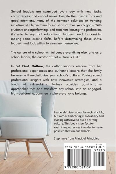 But First, Culture ¿¿School leaders are swamped every day with new tasks, controversies, and critical issues. Despite their best efforts and good intentions, many of the common solutions or trending initiatives still leave them falling short of their yearly goals. With students underperforming, and teachers leaving the profession, it's safe to say that educational leaders need to consider making some drastic shifts. Before determining these shifts, leaders must look within to examine themselves. The culture of a school will influence everything else, and as a school leader, the curator of that culture is YOU! In But First, Culture, the author imparts wisdom from her professional experiences and authentic lessons that she firmly believes will revolutionize your school's culture. Pairing sound professional insights with new innovative strategies, and a touch of vulnerability, Kortney provides administrative approaches that can transform any school into an engaged, high-performing, community where everyone belongs.