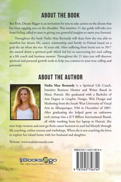 But First, Dream Bigger is an invitation for you to take action on the dream that has been tapping you on the shoulder. is intuitive 21 day guide will take you from feeling called to start to giving you powerful insights to move you forward. Throughout the book Nadia Mau Bernardy will share how she was able to manifest her dream life, career, relationship and family in Hawaii based on goal she set when she was 16 years old. After suffering from burnt out in 2017 she started down a spiritual path which led her to uncovering her soul calling as a life coach and business mentor. Throughout the 21 days you will discover spiritual and personal growth tools to help you connect to your true calling and potential.