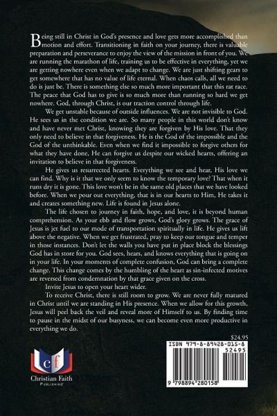 Being still in Christ in God's presence and love gets more accomplished than motion and effort. Transitioning in faith on your journey, there is valuable preparation and perseverance to enjoy the view of the mission in front of you. We are running the marathon of life, training us to be effective in everything, yet we are getting nowhere even when we adapt to change. We are just shifting gears to get somewhere that has no value of life eternal. When chaos call, all we need to do is just be. There is something else so much more important that this rat race. The peace that God has to give is so much more than running so hard we get nowhere. God, through Christ, is our traction control through life. We get unstable because of outside influences. We are not invisible to God. He sees us in the condition we are. So many people in this world don't know and have never met Christ, knowing they are forgiven by His love. That they only need to believe in that forgiveness. He is the God of the impossible and the God of the unthinkable. Even when we find it impossible to forgive others for what they have done, He can forgive us despite our wicked hearts, offering an invitation to believe in that forgiveness. He gives us resurrected hearts. Everything we see and hear, His love we can find. Why is it that we only seem to know the temporary love? That when it runs dry it is gone. This love won't be in the same old places that we have looked before. When we pour out everything, that is in our hearts to Him, He takes it and creates something new. Life is found in Jesus alone. The life chosen to journey in faith, hope, and love, it is beyond human comprehension. As your ebb and flow grows, God's glory grows. The grace of Jesus is jet fuel to our mode of transportation spiritually in life. He gives us lift above the negative. When we get frustrated, pray to keep our tongue and temper in those instances. Don't let the walls you have put in place block the blessings God has in store for you. God sees, hears, and knows everything that is going on in your life. In your moments of complete confusion, God can bring a complete change. This change comes by the humbling of the heart as sin-infected motives are reversed from condemnation by that grace given on the cross. Invite Jesus to open your heart wider. To receive Christ, there is still room to grow. We are never fully matured in Christ until we are standing in His presence. When we allow for this growth, Jesus will peel back the veil and reveal more of Himself to us. By finding time to pause in the midst of our busyness, we can become even more productive in everything we do.