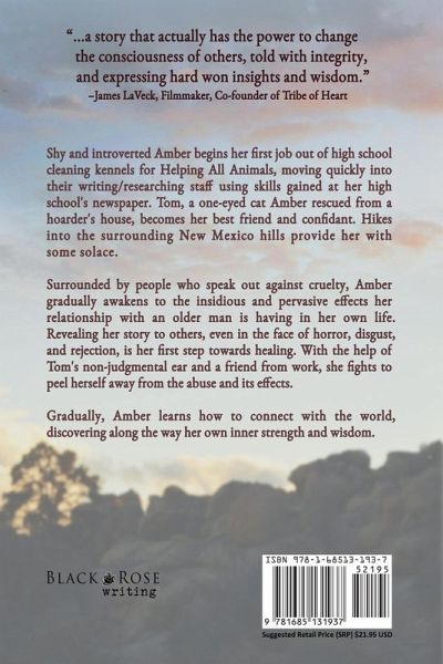 "We kissed again, this one different, with a subtle feeling of urgency behind it that reached way down deep into me, like a hook, pulling on something soft and very tender. I pulled away, fighting an urge to leap up and run." Shy and introverted Amber begins her first job out of high school cleaning kennels for Helping All Animals, moving quickly into their writing/researching staff using skills gained at her high school's newspaper. Tom, a one-eyed cat Amber rescued from a hoarder's house, becomes her best friend and confidant. Hikes into the surrounding New Mexico hills provide her with some solace. Surrounded by people who speak out against cruelty, Amber gradually awakens to the insidious and pervasive effects her relationship with an older man is having in her own life. Revealing her story to others, even in the face of horror, disgust, and rejection, is her first step towards healing. With the help of Tom's non-judgmental ear and a friend from work, she fights to peel herself away from the abuse and its effects. Gradually, Amber learns how to connect with the world, discovering along the way her own inner strength and wisdom.
