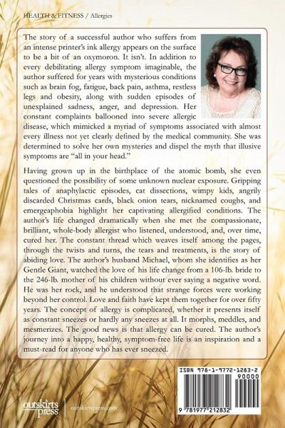 The story of a successful author who suffers from an intense printer's ink allergy appears on the surface to be a bit of an oxymoron. It isn't. In addition to every debilitating allergy symptom imaginable, the author suffered for years with mysterious conditions such as brain fog, fatigue, back pain, asthma, restless legs and obesity, along with sudden episodes of unexplained sadness, anger, and depression. Her constant complaints ballooned into severe allergic disease, which mimicked a myriad of symptoms associated with almost every illness not yet clearly defined by the medical community. She was determined to solve her own mysteries and dispel the myth that illusive symptoms are "all in your head." Having grown up in the birthplace of the atomic bomb, she even questioned the possibility of some unknown nuclear exposure. Gripping tales of anaphylactic episodes, cat dissections, wimpy kids, angrily discarded Christmas cards, black onion tears, nicknamed coughs, and emergeaphobia highlight her captivating allergified conditions. The author's life changed dramatically when she met the compassionate, brilliant, whole-body allergist who listened, understood, and, over time, cured her. The constant thread which weaves itself among the pages, through the twists and turns, the tears and treatments, is the story of abiding love. The author's husband Michael, whom she identifies as her Gentle Giant, watched the love of his life change from a 106-lb. bride to the 246-lb. mother of his children without ever saying a negative word. He was her rock, and he understood that strange forces were working beyond her control. Love and faith have kept them together for over fifty years. The concept of allergy is complicated, whether it presents itself as constant sneezes or hardly any sneezes at all. It morphs, meddles, and mesmerizes. The good news is that allergy can be cured. The author's journey into a happy, healthy, symptom-free life is an inspiration and a must-read for anyone who has ever sneezed.