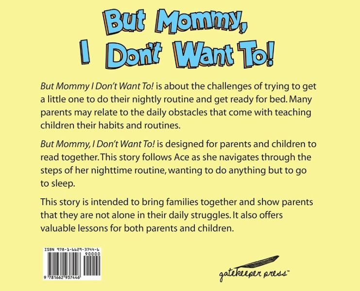 But Mommy I Don't Want To! is about the challenges of trying to get a little one to do their nightly routine and get ready for bed. Many parents may relate to the daily obstacles that come with teaching children their habits and routines. But Mommy, I Don't Want To! is designed for parents and children to read together. This story follows Ace as she navigates through the steps of her nighttime routine, wanting to do anything but to go to sleep. This story is intended to bring families together and show parents that they are not alone in their daily struggles. It also offers valuable lessons for both parents and children.