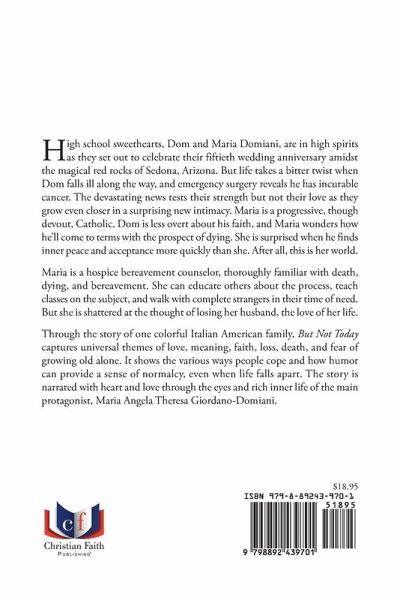 High school sweethearts, Dom and Maria Domiani, are in high spirits as they set out to celebrate their fiftieth wedding anniversary amidst the magical red rocks of Sedona, Arizona. But life takes a bitter twist when Dom falls ill along the way, and emergency surgery reveals he has incurable cancer. The devastating news tests their strength but not their love as they grow even closer in a surprising new intimacy. Maria is a progressive, though devout, Catholic. Dom is less overt about his faith, and Maria wonders how he'll come to terms with the prospect of dying. She is surprised when he finds inner peace and acceptance more quickly than she. After all, this is her world. Maria is a hospice bereavement counselor, thoroughly familiar with death, dying, and bereavement. She can educate others about the process, teach classes on the subject, and walk with complete strangers in their time of need. But she is shattered at the thought of losing her husband, the love of her life. Through the story of one colorful Italian American family, But Not Today captures universal themes of love, meaning, faith, loss, death, and fear of growing old alone. It shows the various ways people cope and how humor can provide a sense of normalcy, even when life falls apart. The story is narrated with heart and love through the eyes and rich inner life of the main protagonist, Maria Angela Theresa Giordano-Domiani.