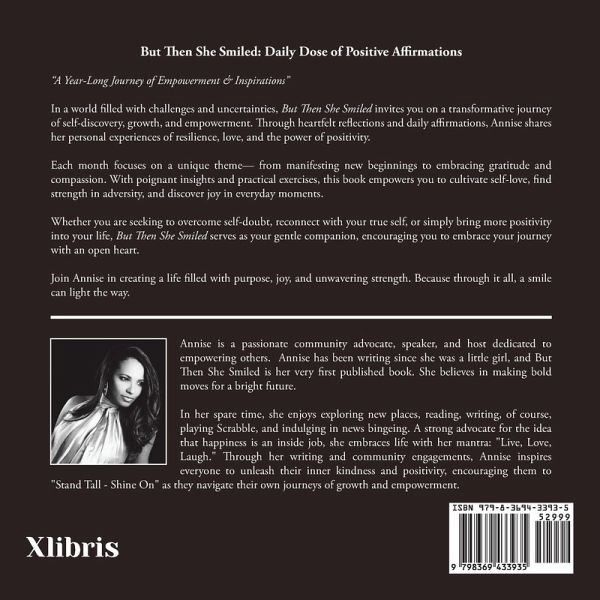 But Then She Smiled: Daily Dose of Positive Affirmations "A Year-Long Journey of Empowerment & Inspirations" In a world filled with challenges and uncertainties, But Then She Smiled invites you on a transformative journey of self-discovery, growth, and empowerment. Through heartfelt reflections and daily affirmations, Annise shares her personal experiences of resilience, love, and the power of positivity. Each month focuses on a unique theme- from manifesting new beginnings to embracing gratitude and compassion. With poignant insights and practical exercises, this book empowers you to cultivate self-love, find strength in adversity, and discover joy in everyday moments. Whether you are seeking to overcome self-doubt, reconnect with your true self, or simply bring more positivity into your life, But Then She Smiled serves as your gentle companion, encouraging you to embrace your journey with an open heart. Join Annise in creating a life filled with purpose, joy, and unwavering strength. Because through it all, a smile can light the way.