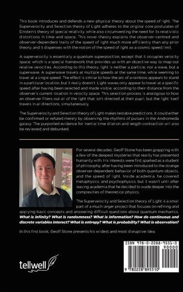 For several decades, Geoff Stone has been grappling with a few of the deepest mysteries that reality has presented humanity with. His interests were first sparked as a student of philosophy, after having been introduced to the strange observer-dependent behaviour of both quantum objects, and the speed of light. Inside academia he covered metaphysics, and psychophysics, but it wasn't until after leaving academia that he decided to wade deeper into the complexities of theoretical physics.The Supervelocity and Selection theory of Light is a small part of a much larger project that focuses on refining and applying basic concepts and answering difficult questions about quantum mechanics. What is infinity? What is randomness? What is information? How do continuous and discrete variables interact? What is entropy? What is probability? What is observation?In this first book, Geoff Stone presents his wildest and most disruptive idea.