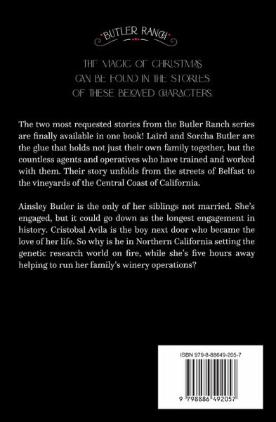 The magic of Christmas can be found in the stories of these beloved characters. ¿¿The two most requested stories from the Butler Ranch series are finally available in one book! Laird and Sorcha Butler are the glue that holds not just their own family together, but the countless agents and operatives who have trained and worked with them. Their story unfolds from the streets of Belfast to the vineyards of the Central Coast of California. Ainsley Butler is the only of her siblings not married. She's engaged, but it could go down as the longest engagement in history. Cristobal Avila is the boy next door who became the love of her life. So why is he in Northern California setting the genetic research world on fire, while she's five hours away helping to run her family's winery operations?