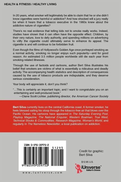 In 20 years, what smoker will legitimately be able to claim that he or she didn't know cigarettes were harmful or addictive? And how shocked will a jury really be when it hears that a tobacco executive in the 1960s knew about the addictive nature of cigarettes? There's no real evidence that telling kids not to smoke really works. Indeed, studies have shown that it can often have the opposite effect. Children, by their very nature, love to defy authority, and spending millions on advertising to vilify the cigarette could ultimately serve to enhance its appeal. The cigarette is and will continue to be forbidden fruit. Even though the films of Hollywood's Golden Age once portrayed smoking as a normal activity, smoking no longer enjoys such popularity-and for good reason. An estimated 3.5 million people worldwide still die each year from smoking-related illnesses. Through the use of factoids and cartoons, author Gilbert M. Silva illustrates his belief that smokers are victims of what is essentially a ridiculous and deadly activity. The accompanying health statistics and description of consequences caused by the use of tobacco products are indisputable, and they deserve serious consideration. Your body will appreciate it, don't you think? '.This is certainly an important topic, and I want to congratulate you on an entertaining and well-produced book." -Diane Scott-Lichter, publishing director, the American Cancer Society