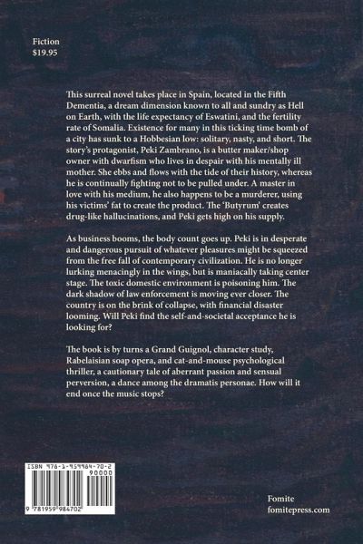 This surreal novel takes place in Spain, located in the Fifth Dementia, a dream dimension known to all and sundry as Hell on Earth, with the life expectancy of Eswatini, and the fertility rate of Somalia. Existence for many in this ticking time bomb of a city has sunk to a Hobbesian low: solitary, nasty, and short. The story's protagonist, Peki Zambrano, is a butter maker/shop owner with dwarfism who lives in despair with his mentally ill mother. She ebbs and flows with the tide of their history, whereas he is continually fighting not to be pulled under. A master in love with his medium, he also happens to be a murderer, using his victims' fat to create the product. The 'Butyrum' creates drug-like hallucinations, and Peki gets high on his supply. As business booms, the body count goes up. Peki is in desperate and dangerous pursuit of whatever pleasures might be squeezed from the free fall of contemporary civilization. He is no longer lurking menacingly in the wings, but is maniacally taking center stage. The toxic domestic environment is poisoning him. The dark shadow of law enforcement is moving ever closer. The country is on the brink of collapse, with financial disaster looming. Will Peki find the self-and-societal acceptance he is looking for? The book is by turns a Grand Guignol, character study, Rabelaisian soap opera, and cat-and-mouse psychological thriller, a cautionary tale of aberrant passion and sensual perversion, a dance among the dramatis personae. How will it end once the music stops?