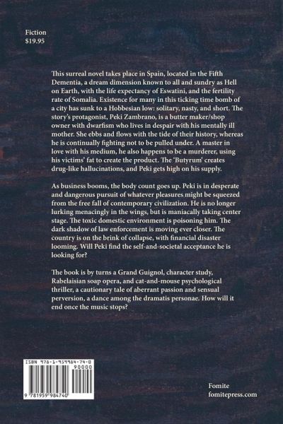 This surreal novel takes place in Spain, located in the Fifth Dementia, a dream dimension known to all and sundry as Hell on Earth, with the life expectancy of Eswatini, and the fertility rate of Somalia. Existence for many in this ticking time bomb of a city has sunk to a Hobbesian low: solitary, nasty, and short. The story's protagonist, Peki Zambrano, is a butter maker/shop owner with dwarfism who lives in despair with his mentally ill mother. She ebbs and flows with the tide of their history, whereas he is continually fighting not to be pulled under. A master in love with his medium, he also happens to be a murderer, using his victims' fat to create the product. The 'Butyrum' creates drug-like hallucinations, and Peki gets high on his supply. As business booms, the body count goes up. Peki is in desperate and dangerous pursuit of whatever pleasures might be squeezed from the free fall of contemporary civilization. He is no longer lurking menacingly in the wings, but is maniacally taking center stage. The toxic domestic environment is poisoning him. The dark shadow of law enforcement is moving ever closer. The country is on the brink of collapse, with financial disaster looming. Will Peki find the self-and-societal acceptance he is looking for? The book is by turns a Grand Guignol, character study, Rabelaisian soap opera, and cat-and-mouse psychological thriller, a cautionary tale of aberrant passion and sensual perversion, a dance among the dramatis personae. How will it end once the music stops?