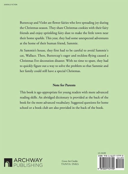 Buttercup and Violet are flower fairies who love spreading joy during the Christmas season. They share Christmas cookies with their fairy friends and enjoy sprinkling fairy dust to make the little town near their home sparkle. This year, they had some unexpected adventures at the home of their human friend, Sammie. At Sammie's house, they first had to be careful to avoid Sammie's cat, Wallace. Then, Buttercup's eager and reckless flying caused a Christmas Eve decoration disaster. With no time to spare, they had to quickly figure out a way to solve the problem so that Sammie and her family could still have a special Christmas.…mehr