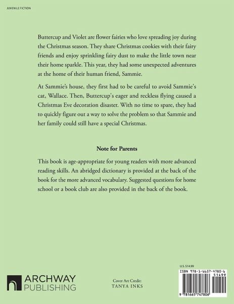 Buttercup and Violet are flower fairies who love spreading joy during the Christmas season. They share Christmas cookies with their fairy friends and enjoy sprinkling fairy dust to make the little town near their home sparkle. This year, they had some unexpected adventures at the home of their human friend, Sammie. At Sammie's house, they first had to be careful to avoid Sammie's cat, Wallace. Then, Buttercup's eager and reckless flying caused a Christmas Eve decoration disaster. With no time to spare, they had to quickly figure out a way to solve the problem so that Sammie and her family could still have a special Christmas.