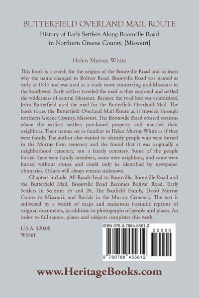 This book is a search for the origins of the Boonville Road and to learn why the name changed to Bolivar Road. Boonville Road was named as early as 1833 and was used as a trade route connecting mid-Missouri to the Southwest. Early settlers traveled the road as they explored and settled the wilderness of central Missouri. Because the road bed was established, John Butterfield used the road for the Butterfield Overland Mail. The book traces the Butterfield Overland Mail Route as it traveled through northern Greene County, Missouri. The Boonville Road crossed sections where the earliest settlers purchased property and married their neighbors. Their names are as familiar to Helen Murray White as if they were family. The author also wanted to identify people who were buried in the Murray farm cemetery and she found that it was originally a neighborhood cemetery, not a family cemetery. Some of the people buried there were family members, some were neighbors, and some were buried without stones and could only be identified by newspaper obituaries. Others will always remain unknown. Chapters include: All Roads Lead to Boonville, Boonville Road and the Butterfield Mail, Boonville Road Becomes Bolivar Road, Early Settlers in Sections 35 and 26, The Banfield Family, David Murray Comes to Missouri, and Burials in the Murray Cemetery. The text is enlivened by a wealth of maps and numerous facsimile reprints of original documents, in addition to photographs of people and places. An index to full names, places and subjects completes this work.