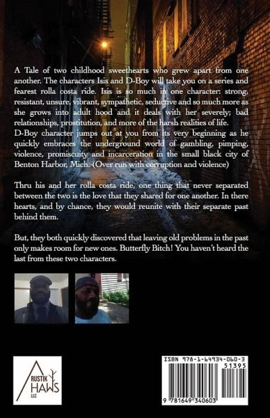 A tale of two childhood sweethearts that grew apart from one another. The characters of Isis and D-Boy on a serious and fearful roller coaster ride. Isis is so much in one character strong and resilient and seductive in one moment and then unsure, vibrant and sympathetic and so much the next. As she grow into adulthood and deals with her severely bad relationships.. prostitution and the harsh realities of life. D Boy character jumps out at you right from its very beginning as he quickly embraces the underground world of gambling pimping violence, promiscuity and incarceration in the small black city of Benton Harbor, Mi.(over run with corruption and violence). Through their separation in life, there is one thing that never separated them from one another and that is the love they shared for one another. And by chance they'd reunite their hearts with their separate past behind them, but both quickly realizing that leaving problems in the past only make room for new ones. Butterfly Bitch you haven't heard the last from these two characters.