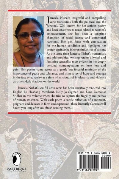 Jameela Nishat's insightful and compelling verse transcends both the political and the personal. Well known for her activist poetry and keen sensitivity to issues related to women's empowerment, she has been a longtime champion of social justice and communal harmony. Her pen flows with compassion for the human condition and highlights her protest against the inherent injustices of society. At the same time Jameela Nishat's humanistic and philosophical writing retains a lyrical and feminine sensuality most evident in her deeply personal contemplations on love, loss and pain. Her poems come across as a gentle but forceful reminder of the importance of peace and tolerance, and shine a ray of hope and courage in the face of adversity at a time when clouds of intolerance and violence cast their dark shadows on the world. Jameela Nishat's soulful urdu verse has been sensitively rendered into English by Hoshang Merchant, Kelly Jo-Cigman and Uma Damodar Sridhar in this volume where she tries to capture the fragility and pathos of human existence. With each poem a subtle reflection of a moment, poignant and delicate in form and expression, these Butterfly Caresses will haunt you long after you finish reading them...