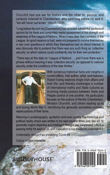 Churchill had one ear for history and the other for politics, and certainly listened to Chamberlain, who said long before he said it: "we will never surrender" (March 1939). "Long before Munich he [Chamberlain] had shocked substantial sections of opinion by his frank and completely realist assessment of the strength and weakness of the League of Nations. When it was clear that members of the League, for good reasons or bad, were not prepared to involve themselves in war over questions in which they themselves had no direct interest, it was obviously idle to pretend that there was any such thing as 'collective security' on which nations could confidently rely for their own protection." "There was at this date no 'League of Nations', ...and if ever there was a phrase without meaning it was 'collective security' as opposed to national security under the conditions of the later thirties." With numerous historical facts and insights in current affairs, Irish author, artist, and historian, Robert Ewing explores Anglo-Irish affairs and Irish life, and thereby challenges a number of international myths and State cultures as involving media posture between State and People control of one another. He particularly focuses on the actions of Neville Chamberlain, Winston Churchill, and others leading up to and during World War II, identifying the generally somewhat confused repercussions of their fame. Weaving in autobiography, quotation and even poetry, this historical and political reality-check was written to be read several times and, like art, to generally inspire objective and intelligent thought and awareness. Life is a passing entity for each of us, and inspiration is our means to understand it. Colour edition available