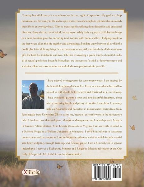 Creating beautiful poetry is a wondrous joy for me, a gift of expression. My goal is to help individuals see the beauty in life and to open their eyes to the simplistic splendor that surrounds their life on an everyday basis. With so many people suffering from depression and emotional disorders, along with the rate of suicide increasing on a daily basis, my goal is to lift human beings to a more beautiful place by nurturing God, nature, faith, hope, and love. Helping people to see that we are all in this life together and developing a bonding unity between all is what the Lords plan is for all living things. It is so important to see, feel, and breathe in all the wondrous gifts the Lord has instilled in our lives. Whether its enjoying a gentle touch, a beautiful smile, all of natures perfection, beautiful friendships, the innocence of a child, or family moments and activities, allow my book to assist and unlock the true purpose within your life.