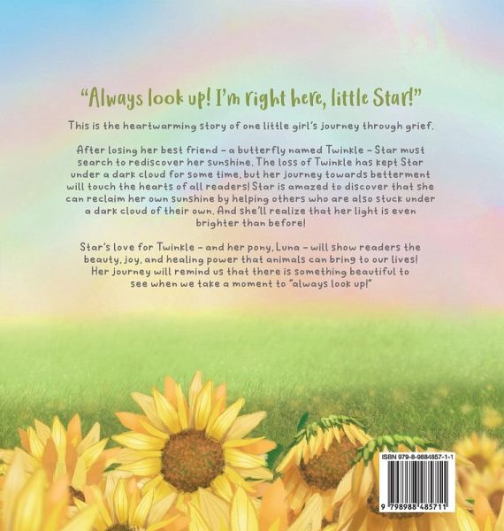 This is the heartwarming story of one little girl's journey through grief. After losing her best friend, a butterfly named Twinkle, Star must search to rediscover her sunshine. Star's love for Twinkle-and her pony, Luna-will show readers the beauty, joy, and healing power that animals can bring to our lives! Her journey reminds us that there is something beautiful to see when we take a moment to "always look up!"
