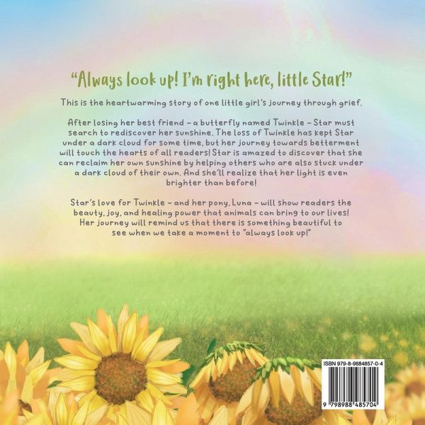 This is the heartwarming story of one little girl's journey through grief. After losing her best friend, a butterfly named Twinkle, Star must search to rediscover her sunshine. Star's love for Twinkle-and her pony, Luna-will show readers the beauty, joy, and healing power that animals can bring to our lives! Her journey reminds us that there is something beautiful to see when we take a moment to "always look up!"