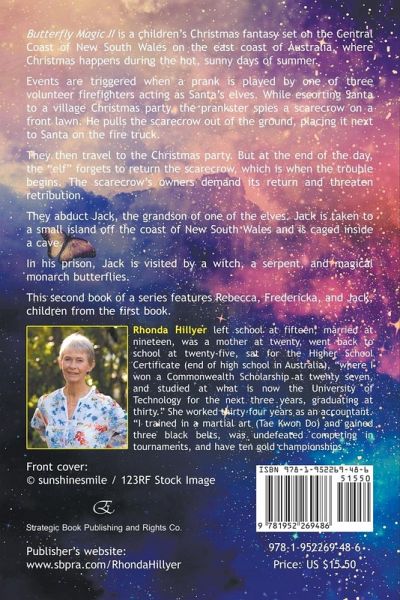 Butterfly Magic II is a children's Christmas fantasy set on the Central Coast of New South Wales on the east coast of Australia, where Christmas happens during the hot, sunny days of summer. Events are triggered when a prank is played by one of three volunteer firefighters acting as Santa's elves. While escorting Santa to a village Christmas party, the prankster spies a scarecrow on a front lawn. He pulls the scarecrow out of the ground, placing it next to Santa on the fire truck. They then travel to the Christmas party. But at the end of the day, the "elf" forgets to return the scarecrow, which is when the trouble begins. The scarecrow's owners demand its return and threaten retribution. They abduct Jack, the grandson of one of the elves. Jack is taken to a small island off the coast of New South Wales and is caged inside a cave. In his prison, Jack is visited by a witch, a serpent, and magical monarch butterflies. This second book of a series features Rebecca, Fredericka, and Jack, children from the first book. Author Bio: Rhonda Hillyer left school at fifteen, married at nineteen, was a mother at twenty, went back to school at twenty-five, sat for the Higher School Certificate (end of high school in Australia), "where I won a Commonwealth Scholarship at twenty seven, and studied at what is now the University of Technology for the next three years, graduating at thirty." She worked thirty-four years as an accountant. "I trained in a martial art (Tae Kwon Do) and gained three black belts, was undefeated competing in tournaments, and have ten gold championships."
