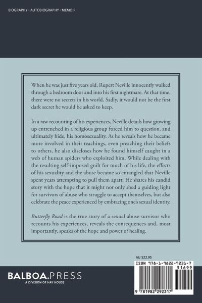 When he was just five years old, Rupert Neville innocently walked through a bedroom door and into his first nightmare. At that time, there were no secrets in his world. Sadly, it would not be the first dark secret he would be asked to keep. In a raw recounting of his experiences, Neville details how growing up entrenched in a religious group forced him to question, and ultimately hide, his homosexuality. As he reveals how he became more involved in their teachings, even preaching their beliefs to others, he also discloses how he found himself caught in a web of human spiders who exploited him. While dealing with the resulting self-imposed guilt for much of his life, the effects of his sexuality and the abuse became so entangled that Neville spent years attempting to pull them apart. He shares his candid story with the hope that it might not only shed a guiding light for survivors of abuse who struggle to accept themselves, but also celebrate the peace experienced by embracing one's sexual identity. Butterfly Road is the true story of a sexual abuse survivor who recounts his experiences, reveals the consequences and, most importantly, speaks of the hope and power of healing.