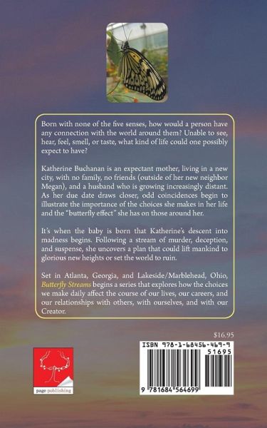 Born with none of the five senses, how would a person have any connection with the world around them? Unable to see, hear, feel, smell, or taste, what kind of life could one possibly expect to have? Katherine Buchanan is an expectant mother, living in a new city, with no family, no friends (outside of her new neighbor Megan), and a husband who is growing increasingly distant. As her due date draws closer, odd coincidences begin to illustrate the importance of the choices she makes in her life and the "butterfly effect" she has on those around her. It's when the baby is born that Katherine's descent into madness begins. Following a stream of murder, deception, and suspense, she uncovers a plan that could lift mankind to glorious new heights or set the world to ruin. Set in Atlanta, Georgia, and Lakeside/Marblehead, Ohio, Butterfly Streams begins a series that explores how the choices we make daily affect the course of our lives, our careers, and our relationships with others, with ourselves, and with our Creator.