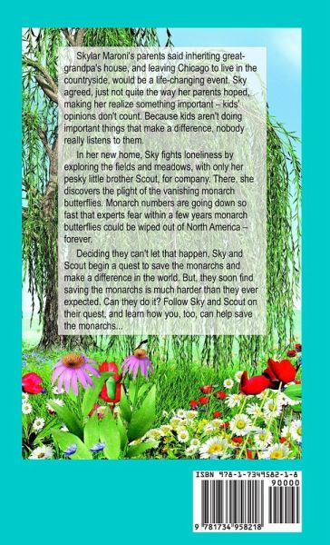 Skylar Maroni's parents said inheriting great-grandpa's house, and leaving Chicago to live in the countryside, would be a life-changing event. Sky agreed, just not quite the way her parents hoped, making her realize something important - kids' opinions don't count. Because kids aren't doing important things that make a difference, nobody really listens to them. In her new home, Sky fights loneliness by exploring the fields and meadows, with only her pesky little brother Scout, for company. There, she discovers the plight of the vanishing monarch butterflies. Their numbers are going down so fast that experts fear within a few years monarch butterflies could be wiped out of North America - forever. Deciding they can't let that happen, Sky and Scout begin a quest to save the monarchs and make a difference in the world. But, they soon find saving them is much harder than they ever expected. Can they do it? Follow Sky and Scout on their quest, and learn how you, too, can help save the monarchs... Parents/Teachers/Librarians: This wonderful little book is a great addition to your STEM library. It will make readers smile, as well as touch hearts, even as it delivers the important science facts about monarchs at age appropriate levels. An Appendix of Fun Facts, including scientifically correct drawings and a glossary, encourages additional learning. Appropriate for ages 9 and up.
