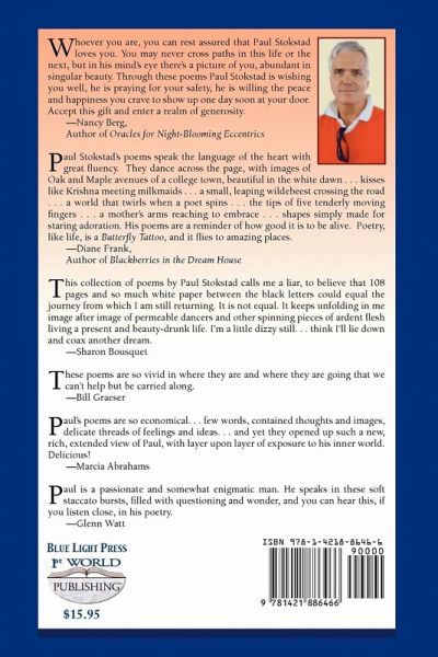 For the first few decades, Paul was mostly interested in girls, tennis and pole vaulting. In college he dabbled in theatre, wearing long hair and an earring, and did some poetry writing at the U of Iowa undergraduate writers workshop, receiving a "Citation for Excellence in Creative Writing." Later interests have included ad copywriting, disco, improv theatre, attachment parenting, and Netflix. He self-published a tennis book and an improv theater book. The latter is ranked 2,171,018 on Amazon. He has been practicing Transcendental Meditation twice a day since 1970, though he did miss once in 1997 (he still blames Deborah). He has a BA in English, an MA in English and Linguistics, an MA in the Science of Creative Intelligence, and some kind of honorary Ph.D in World peace, from MERU, we think. Professionally he has worked mostly in advertising and web marketing, and as of May 2012 serves as the Marketing Director for MUM.edu. "Whoever you are, you can rest assured that Paul Stokstad loves you. You may never cross paths in this life or the next, but in his mind's eye there's a picture of you, abundant in singular beauty. Through these poems Paul Stokstad is wishing you well, he is praying for your safety, he is willing the peace and happiness you crave to show up one day soon at your door. Accept this gift and enter a realm of generosity." -Nancy Berg, Author of Oracles for Night-Blooming Eccentrics Paul Stokstad's poems speak the language of the heart with great fluency. "They dance across the page, with images of Oak and Maple avenues of a college town, beautiful in the white dawn . . . kisses like Krishna meeting milkmaids . . . a small, leaping wildebeest crossing the road . . . a world that twirls when a poet spins . . . the tips of five tenderly moving fingers . . . a mother's arms reaching to embrace . . . shapes simply made for staring adoration. His poems are a reminder of how good it is to be alive. Poetry, like life, is a Butterfly Tattoo, and it flies to amazing places." -Diane Frank, Author of Blackberries in the Dream House "This collection of poems by Paul Stokstad calls me a liar, to believe that 108 pages and so much white paper between the black letters could equal the journey from which I am still returning. It is not equal. It keeps unfolding in me image after image of permeable dancers and other spinning pieces of ardent flesh living a present and beauty-drunk life. I'm a little dizzy still. . . think I'll lie down and coax another dream." -Sharon Bousquet "These poems are so vivid in where they are and where they are going that we can't help but be carried along." -Bill Graeser "Paul's poems are so economical. . . few words, contained thoughts and images, delicate threads of feelings and ideas. . . and yet they opened up such a new, rich, extended view of Paul, with layer upon layer of exposure to his inner world. Delicious!" -Marcia Abrahams "Paul is a passionate and somewhat enigmatic man. He speaks in these soft staccato bursts, filled with questioning and wonder, and you can hear this, if you listen close, in his poetry." -Glenn Watt