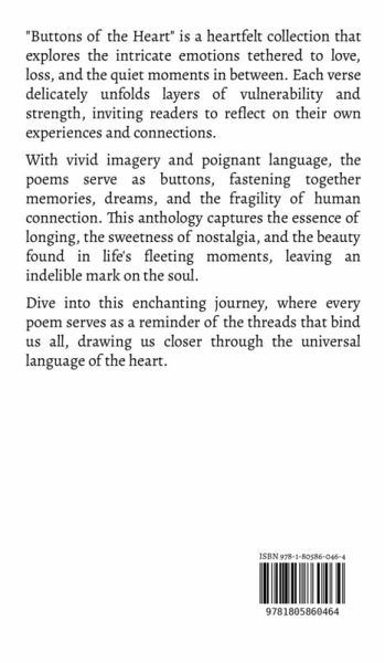 "Buttons of the Heart" is a heartfelt collection that explores the intricate emotions tethered to love, loss, and the quiet moments in between. Each verse delicately unfolds layers of vulnerability and strength, inviting readers to reflect on their own experiences and connections. With vivid imagery and poignant language, the poems serve as buttons, fastening together memories, dreams, and the fragility of human connection. This anthology captures the essence of longing, the sweetness of nostalgia, and the beauty found in life's fleeting moments, leaving an indelible mark on the soul. Dive into this enchanting journey, where every poem serves as a reminder of the threads that bind us all, drawing us closer through the universal language of the heart.