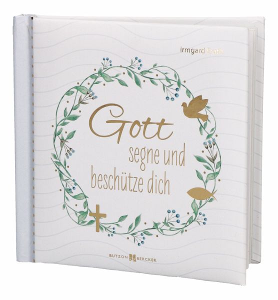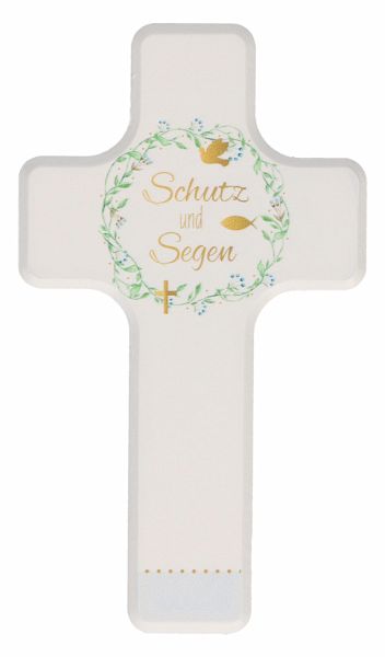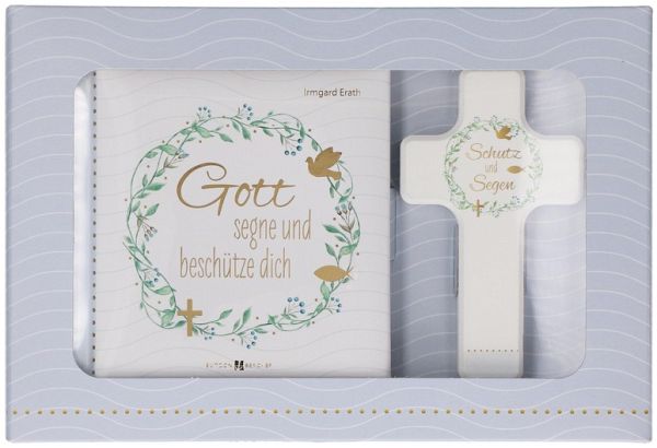 Das liebevoll zusammengestellte Geschenkset zur Taufe "Gott segne und beschütze dich" besteht aus einem Holzkreuz aus echter Buche und einem gebundenen Buch. Das in der Farbe Weiß lackierte Kreuz hat die Maße 6,5 x 11 Zentimeter. Auf dem Holzkreuz ist der Taufspruch "Gott segne und behüte dich" in der Farbe Violett aufgedruckt. Oberhalb des Spruches rundet das Symbol des Fisches inmitten einer Vielzahl von bunten Punkten das künstlerisch arrangierte Motiv ab.Das schöne Design auf dem Holzkreuz wiederholt sich auf dem Einband des wattierten Buches, das die Maße 11 x 11 Zentimeter hat. Das Geschenkset ist optisch ansprechend in einem weißen Karton mit einem zum Teil transparent gestalteten Deckel verpackt, sodass der komplette Inhalt auf den ersten Blick sichtbar ist.