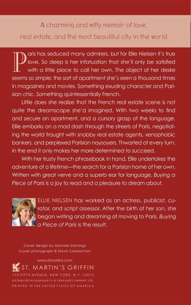 Buying a Piece of Paris is a charming and witty love song to the most beautiful city in the world. Paris has seduced many admirers, but for Ellie Nielsen it's true love. So deep is her infatuation that she'll only be satisfied with a little place to call her own. The object of her desire seems so simple: the sort of apartment she's seen a thousand times in magazines and movies. Something effortlessly charming, and quirky, and old- and expertly decorated. Something exuding character and Parisian chic. Something quintessentially French. Little does she realize that the French real estate scene is not quite the dreamscape she'd imagined. With two weeks to find and secure an apartment, and a cursory grasp of the language, Ellie embarks on a mad dash through the streets of Paris, negotiating the fraught world snobby real estate agents, xenophobic bankers and perplexed Parisian naysayers. Thwarted at every turn, in the end it only makes her more determined to succeed. With her trusty French phrasebook in hand, and plucked up reserves of savoir faire, Ellie undertakes the adventure of a lifetime. Beauty is everywhere even if, like all true romances, there are many obstacles to be overcome. But then, c'est toujours comme ça à Paris. Written with great verve and a superb ear for language, Buying a Piece of Paris is a joy to read and a pleasure to dream about.
