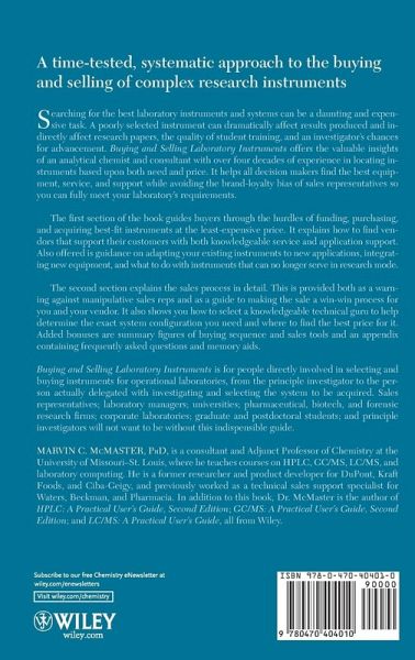 Searching for laboratory instruments and systems can be daunting and expensive. Sales reps can help, but, ultimately, their loyalty lies elsewhere. Buying and Selling Laboratory Instruments: A Practical Consulting Guide offers the insights of a chemist/consultant with over four decades of experience in locating instruments based upon both need and price, while avoiding the brand loyalty of sales reps. Laboratory managers, universities, and pharmaceutical, biotech and forensic research firms will not want to be without this indispensible guide for selling and locating the best lab equipment, services, and application support.
