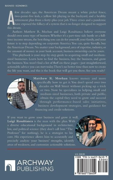 A few decades ago, the American Dream meant a white picket fence, two-point-five kids, a yellow lab playing in the backyard, and a healthy retirement plan from a forty-plus-year job. Three crises and a pandemic have exposed the fallacy of a system that is no longer designed to support this dream. Authors Matthew R. Meehan and Luigi Rosabianca believe everyone should own some type of business. Whether it's a part-time side hustle or a full-time income stream, the best thing you can do for yourself, your family, and your future is to stop depending on corporate America. You can, quite literally, buy the American Dream. No matter your background, area of expertise, industry, or the amount of money in your bank account, business ownership can be yours. This playbook is your step-by-step guide to acquiring small and medium-sized businesses. Learn how to find the business, buy the business, and grow the business. You won't find a lot of fluff on these pages-just straightforward, actionable advice you can start today. There's no better time than now to create the life you want, and this is the book that will get you there. Are you ready?