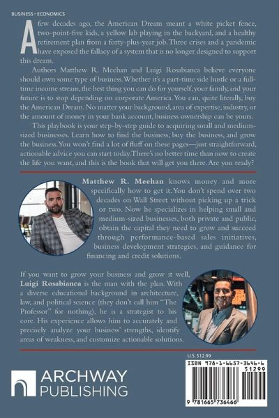 A few decades ago, the American Dream meant a white picket fence, two-point-five kids, a yellow lab playing in the backyard, and a healthy retirement plan from a forty-plus-year job. Three crises and a pandemic have exposed the fallacy of a system that is no longer designed to support this dream. Authors Matthew R. Meehan and Luigi Rosabianca believe everyone should own some type of business. Whether it's a part-time side hustle or a full-time income stream, the best thing you can do for yourself, your family, and your future is to stop depending on corporate America. You can, quite literally, buy the American Dream. No matter your background, area of expertise, industry, or the amount of money in your bank account, business ownership can be yours. This playbook is your step-by-step guide to acquiring small and medium-sized businesses. Learn how to find the business, buy the business, and grow the business. You won't find a lot of fluff on these pages-just straightforward, actionable advice you can start today. There's no better time than now to create the life you want, and this is the book that will get you there. Are you ready?