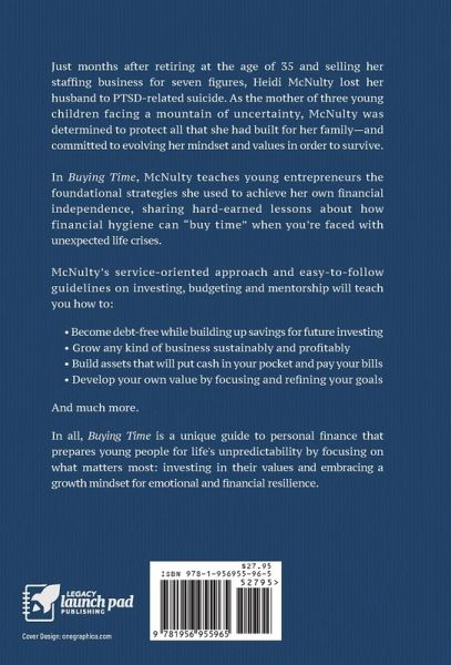 Just months after retiring at the age of 35 and selling her staffing business for seven figures, Heidi McNulty lost her husband to PTSD-related suicide. As the mother of three young children facing a mountain of uncertainty, McNulty was determined to protect all that she had built for her family-and committed to evolving her mindset and values in order to survive. In Buying Time, McNulty teaches young entrepreneurs the foundational strategies she used to achieve her own financial independence, sharing hard-earned lessons about how financial hygiene can "buy time" when you're faced with unexpected life crises. McNulty's service-oriented approach and easy-to-follow guidelines on investing, budgeting and mentorship will teach you how to: -Become debt-free while building up savings for future investing -Grow any kind of business sustainably and profitably -Build assets that will put cash in your pocket and pay your bills -Develop your own value by focusing and refining your goals And much more. In all, Buying Time is a unique guide to personal finance that prepares young people for life's unpredictability by focusing on what matters most: investing in their values and embracing a growth mindset for emotional and financial resilience.
