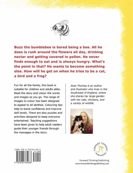 Buzz the bumblebee is bored being a bee. All he does is rush around the flowers all day, drinking nectar and getting covered in pollen. He never finds enough to eat and is always hungry. What's the point in that? He wants to become something else. How will he get on when he tries to be a cat, a bird and a frog? Suitable for children and adults alike. Read the story and colour the words and images as you go. The range of images to colour has been designed to appeal to all abilities. Colouring tips help to boost confidence and improve skill levels. There are also puzzles and activities designed to keep everyone entertained. Teaching suggestions have been given to help adult readers guide their younger friends through the messages in the story.