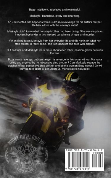 Buzz- intelligent, aggrieved and revengeful. Markayla- blameless, lovely and charming. An unexpected turn happens when Buzz seeks revenge for his sister's murder. He falls in love with the enemy's sister! Markayla didn't know what her step brother had been doing. She was simply an innocent bystander in this messed up scheme of kidnapping and murder. When Buzz takes Markayla from her everyday life and fills her in on what her step brother is really doing, she is in disbelief and filled with disgust. But as Buzz and Markayla learn more about each other, passion grows between the two. Buzz wants revenge, but can he get his revenge for his sister without Markayla being endangered by her obsessive step brother? Can Markayla escape the clutches of her possessive step brother and be the woman Buzz needs? Or will they be torn apart by a murderous, manipulative individual? ¿Can be read as a stand alone. Characters from the Wolfsbane Ridge MC series make appearances in this title.